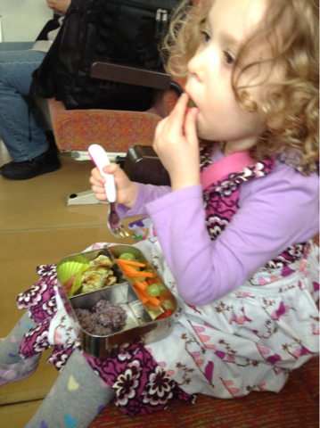 When we woke up this morning she asked her usual question "Is today school?" Usually when I answer yes she cries inconsolably for at least 5 minutes. So today I was hesitant to answer. She asked a second time and I said "Yes, today is school." She shouted out "Yay!!!" This is usually her answer when I say no. So I repeated myself thinking she had misunderstood. "Today IS a school day sweetheart." She shouted out again "Yay! Yay! I love school I love school! I love my friends!" I was shocked and thrilled! She did start to cry though because she asked about her lunch and it wasn't what she was hoping for. On Monday I had to send her with a bento (boxed lunch) and today I was only supposed to send rice. She wanted mama's special bento again and I told her I couldn't do that today. Then we got up and she said "Can I at least take gari with my rice?" (Gari is pickled ginger and Violet is an addict!) So I said yes. We sewed a quick new bag for her lunch box because the bento box she wanted to take wouldn't fit in the bag we were going to use. So I made a new one this morning and repacked the lunch. I just really wanted the morning to go smoothly for her and I had the time. Then we had breakfast, read some books and got dressed for school. We took some photos outside and in the car and at school.